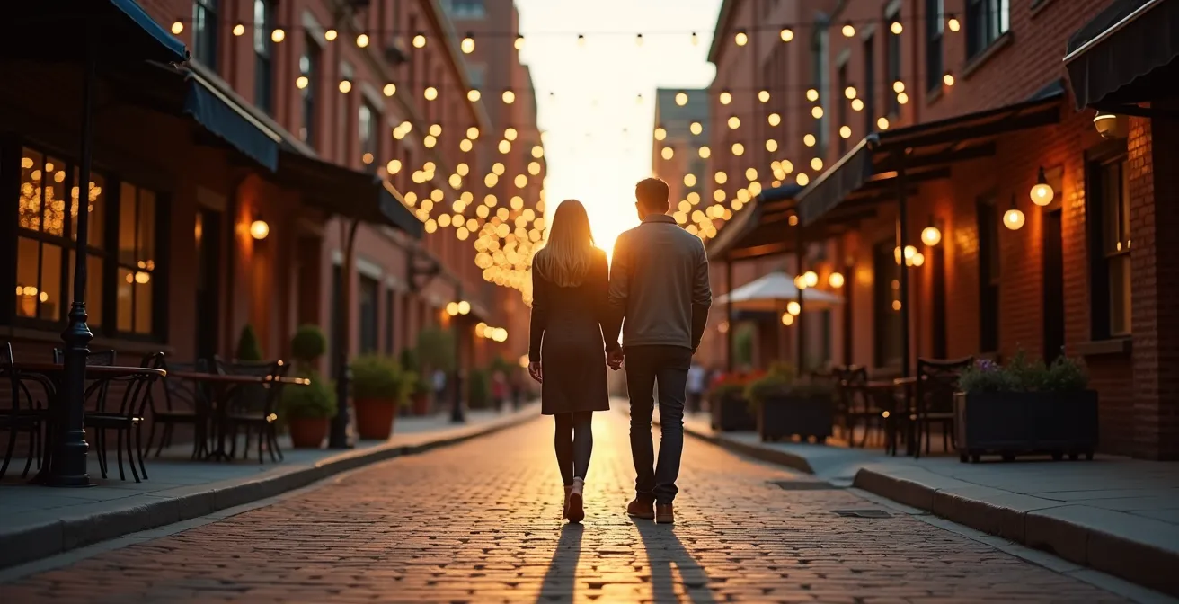 During the day, the natural light illuminates the rich textures of the Victorian brick and allows for crisp, detailed photos of the architecture and public art. It’s the best time for classic portraits where you and your partner are the clear subjects against the historic backdrops. Crowds are generally more moderate, especially on weekdays, making it easier to frame a shot without a dozen strangers in the background. The evening, however, is when the district’s famous magic comes alive. The glow from over 80,000 Christmas lights during the Winter Village, combined with the permanent string lights and fire features, creates a dreamy, romantic atmosphere perfect for capturing moody, ambient shots with beautiful bokeh.
